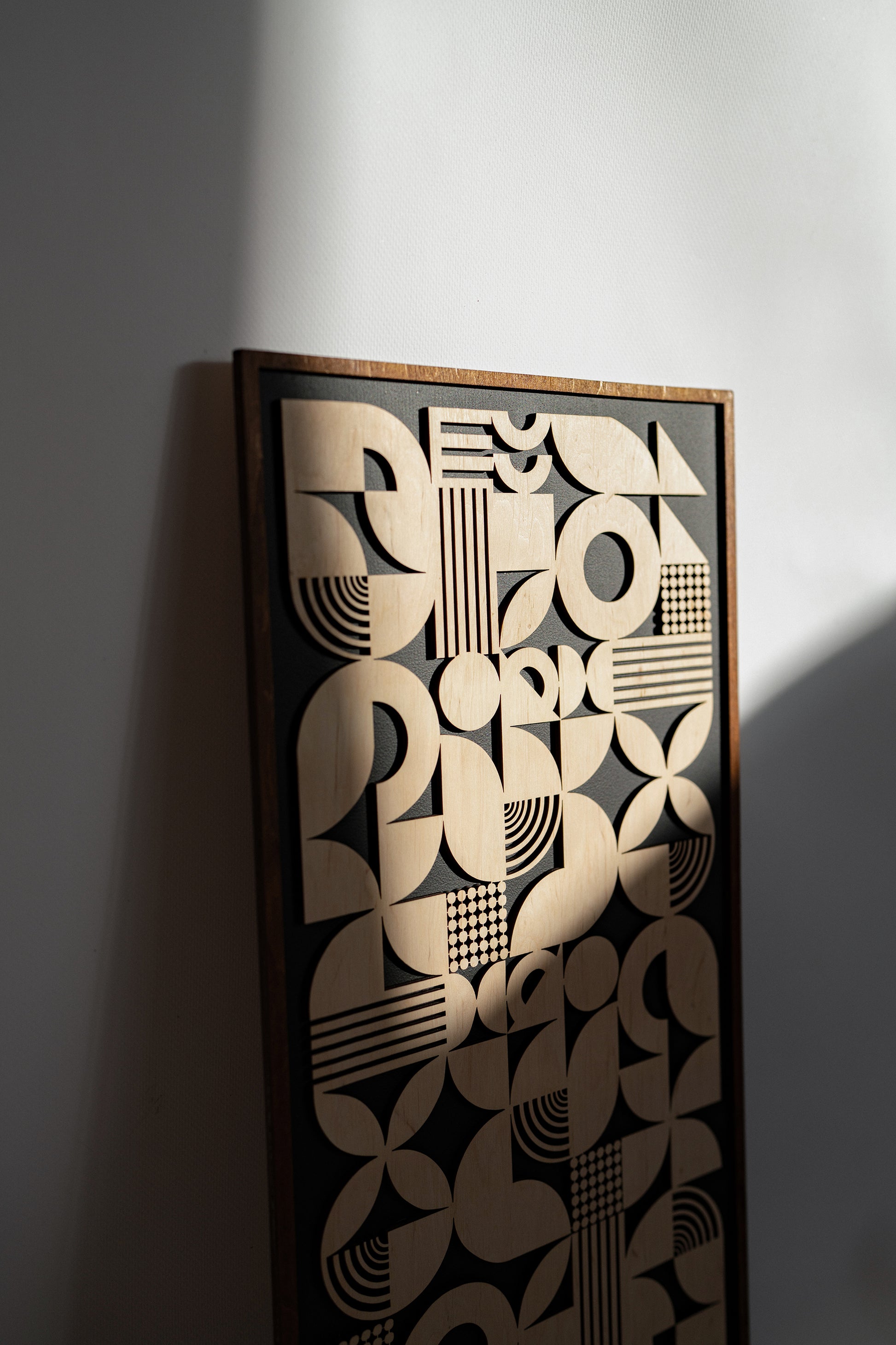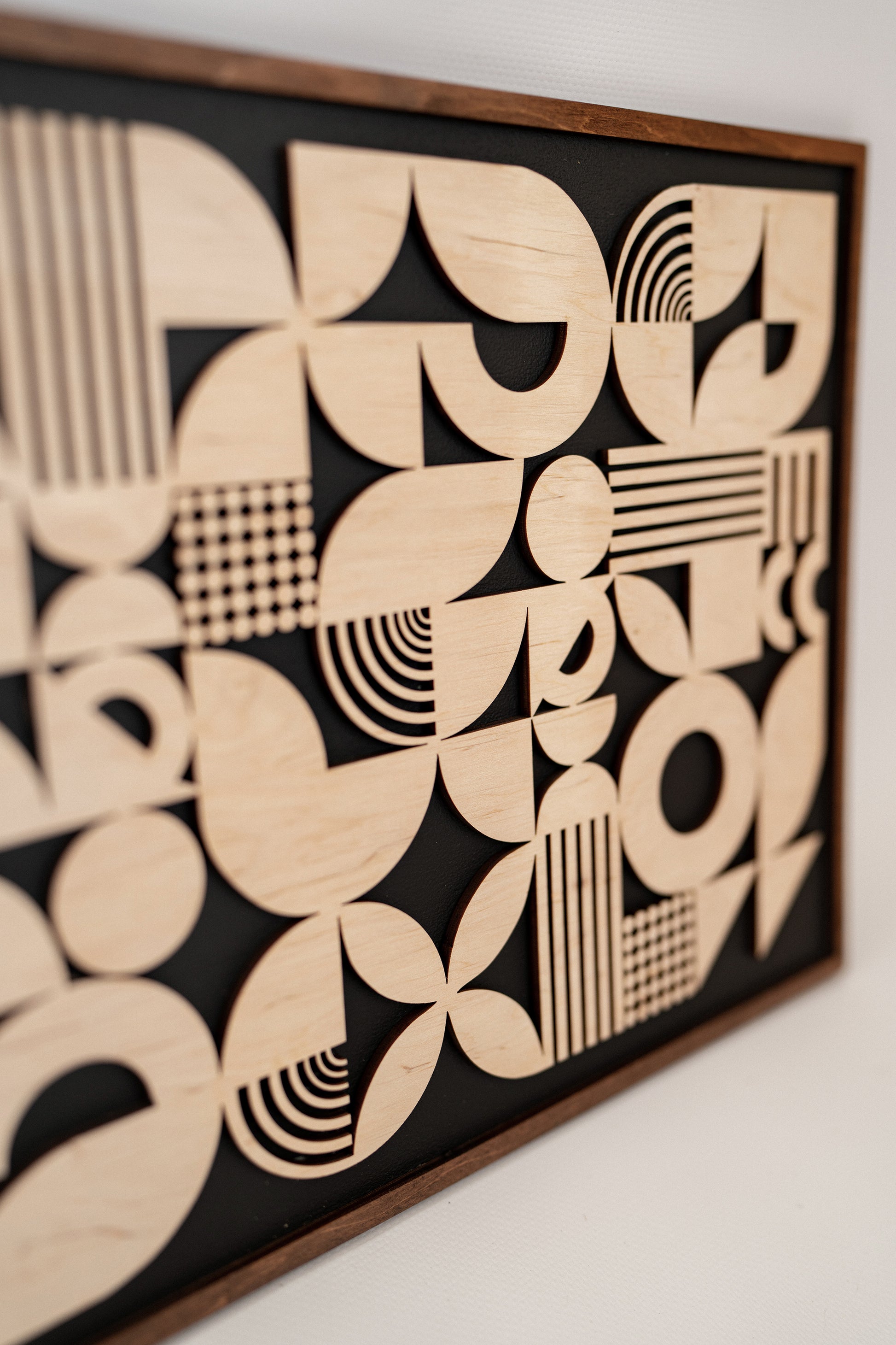 • Color: dark wood frame and black background with a natural second layer of Bauhaus pattern (customizable upon request)