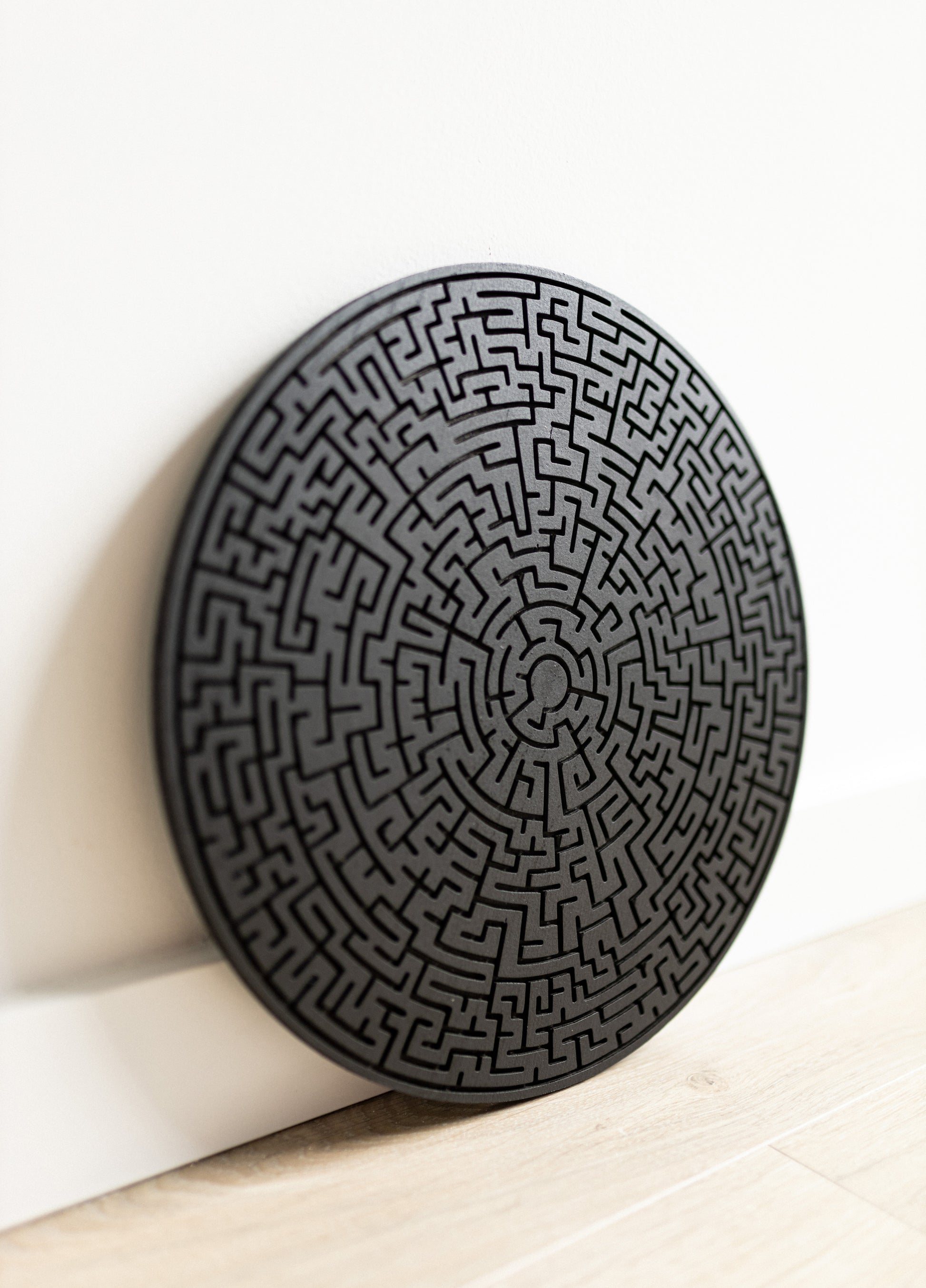 This circular labyrinth design is laser-cut from high-quality wood, finished in sleek black for a bold and contemporary look.
